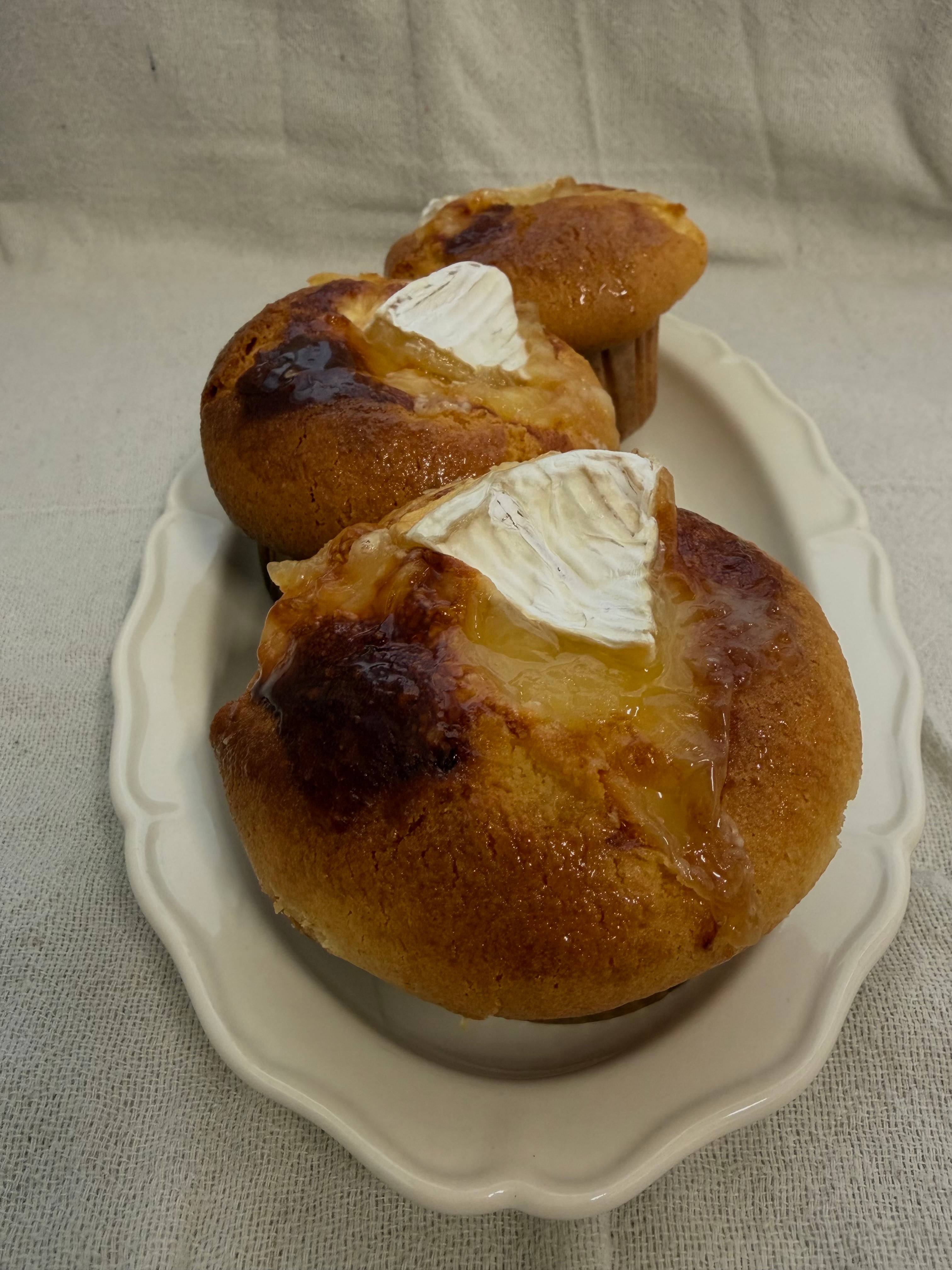 蜂蜜を混ぜ込んだ生地にクリームチーズを閉じ込めてカマンベールチーズをちょこん。温めるとチーズがとろーりです。